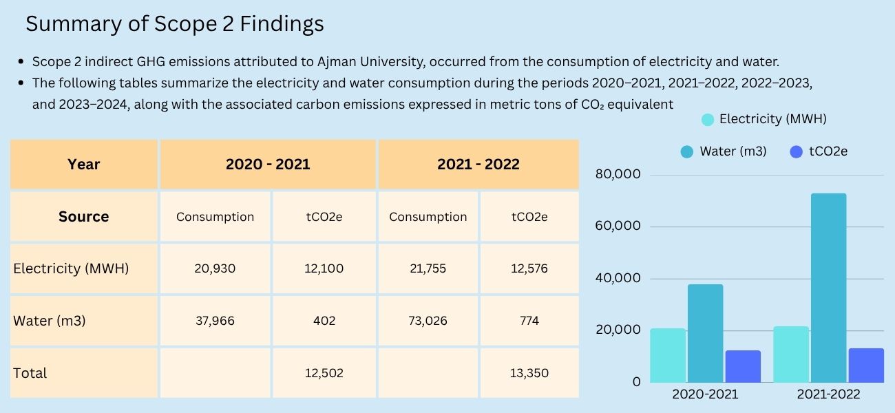 Scope 2 indirect GHG emissions attributed to Ajman University, occurred from the consumption of electricity from 13 buildings: