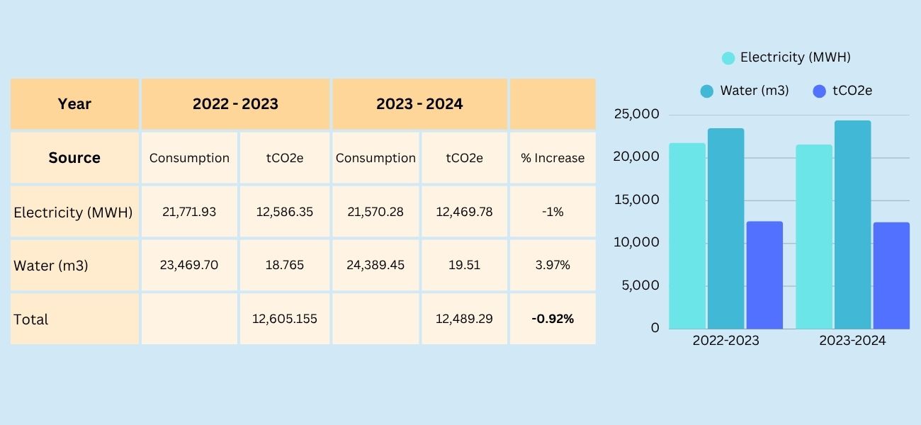 - Emissions from mobile combustion (petrol and diesel) are significantly higher than in 2022–2023 and 2021–2022. These emissions could be further reduced by replacing current vehicles with electric or hybrid models. Research by the European Energy Agency indicates that electric vehicles produce 17–30% less carbon emissions compared to petrol or diesel vehicles.