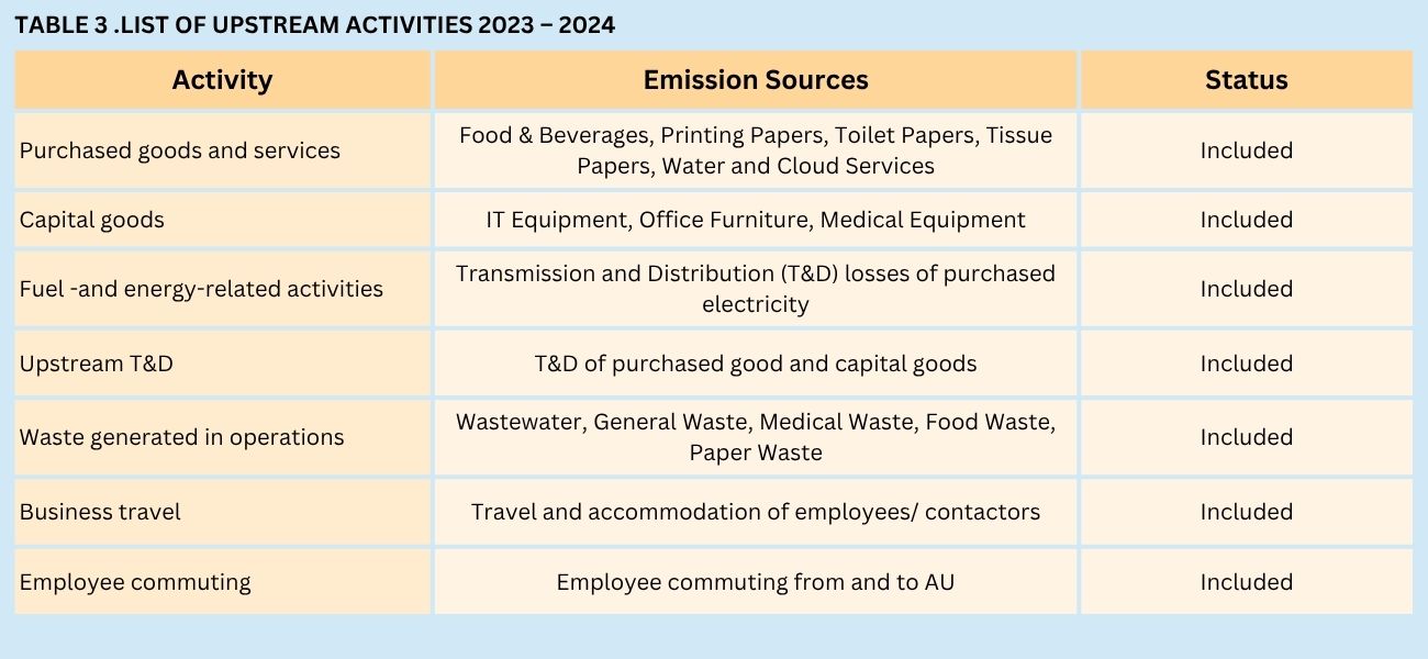 Scope 3 indirect GHG emissions attributed to Ajman University, occurred from the consumptions of upstream activities listed in the following table: